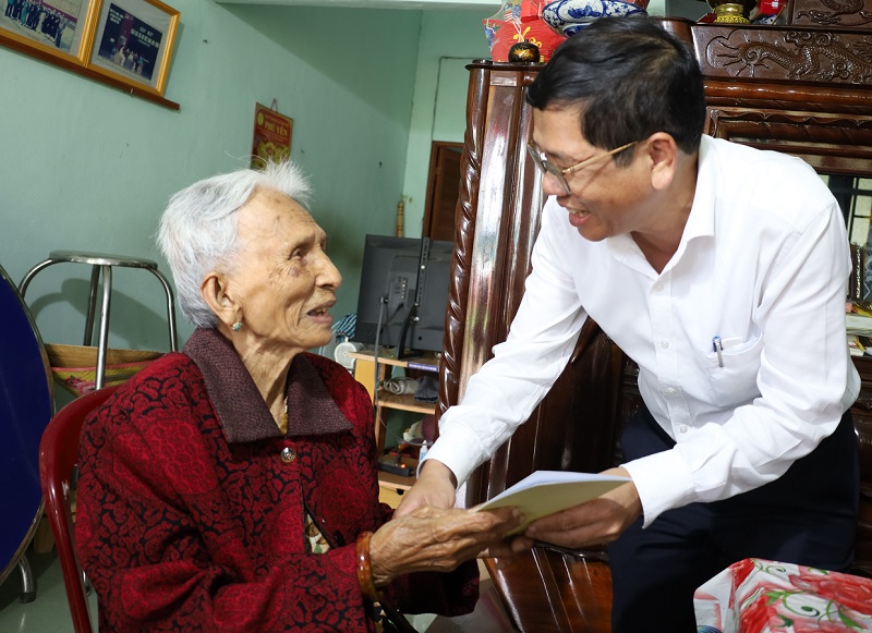 Đồng chí Nguyễn Phương Đông, Tỉnh uỷ viên, Bí thư Huyện uỷ thăm, tặng quà Mẹ VNAH Lê Thị Huệ, xã Hoà Tân Tây