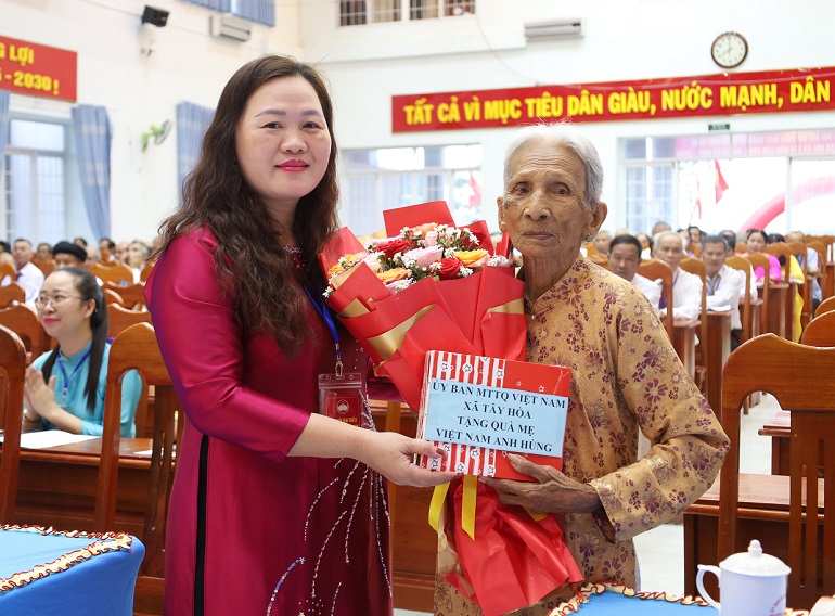 Đồng chí Nguyễn Ngọc Ảnh, UVBTV Đảng uỷ, Chủ tịch Uỷ ban MTTQ Việt Nam xã tặng hoa và quà Mẹ VNAH Lê Thị Huệ