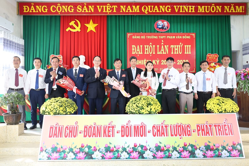 Phát biểu chỉ đạo tại Đại hội, đồng chí Nguyễn Phương Đông, TUV, Bí thư Huyện uỷ ghi nhận và biểu dương những kết quả mà Đảng bộ Trường THPT Phạm Văn Đồng đạt được trong nhiệm kỳ qua, góp phần tích cực cùng toàn huyện thực hiện thắng lợi chỉ tiêu về giáo dục mà Nghị quyết Đại hội đại biểu Đảng bộ huyện lần thứ XII đề ra. Đồng chí mong muốn trong thời gian tới, Đảng bộ tập trung lãnh đạo, chỉ đạo thực hiện tốt nhiệm vụ chính trị được giao; tiếp tục nâng cao chất lượng đào tạo và giữ vững trường đạt chuẩn quốc gia cấp độ 1. Xác định xây dựng Đảng bộ trong sạch, vững mạnh là nhiệm vụ trọng tâm; đẩy mạnh “Học tập và làm theo tư tưởng, đạo đức, phong cách Hồ Chí Minh” gắn với công tác phát triển đảng viên, nâng cao chất lượng sinh hoạt chi bộ. Tăng cường công tác kiểm tra, giám sát và thi hành kỷ luật trong Đảng.