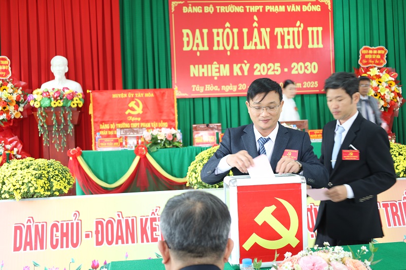 Với tinh thần đoàn kết, thống nhất cao, Đại hội đã bầu Ban Chấp hành Đảng bộ Trường THPT Phạm Văn Đồng khóa III, nhiệm kỳ 2025 – 2030 gồm 09 đồng chí. Đồng chí Nguyễn Thanh Giới, Hiệu trưởng nhà trường tiếp tục được bầu làm Bí thư Đảng ủy, nhiệm kỳ 2025 – 2030.