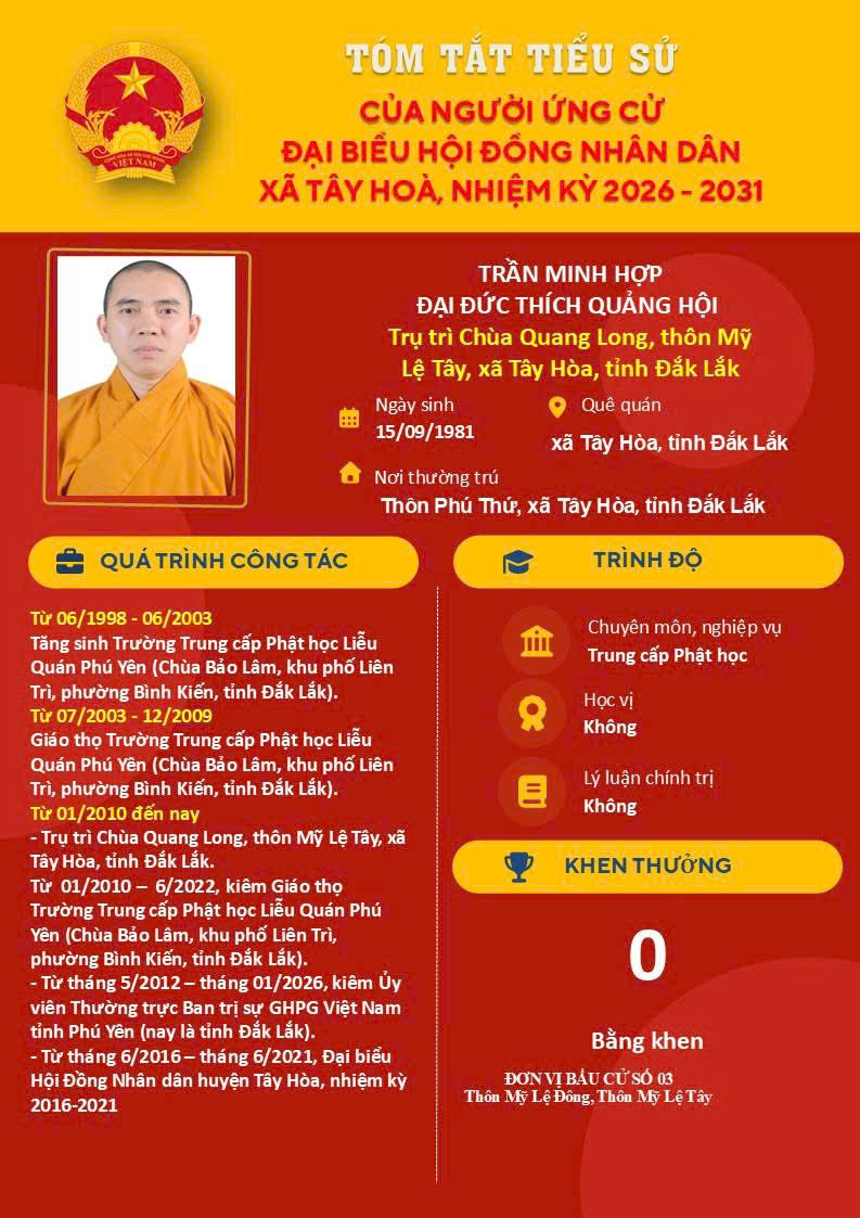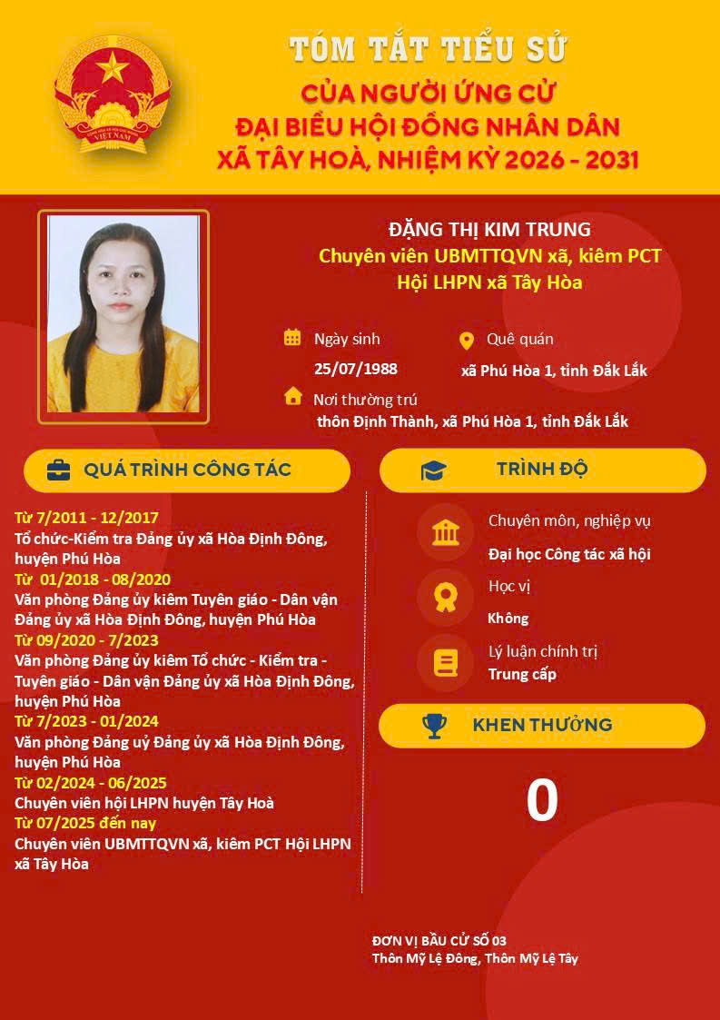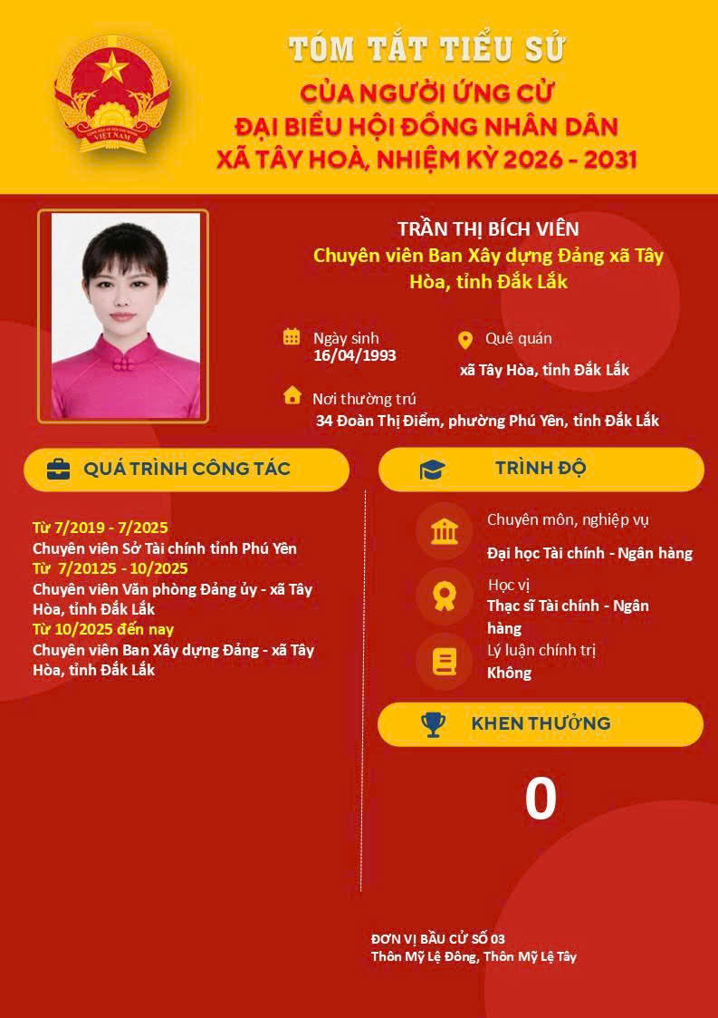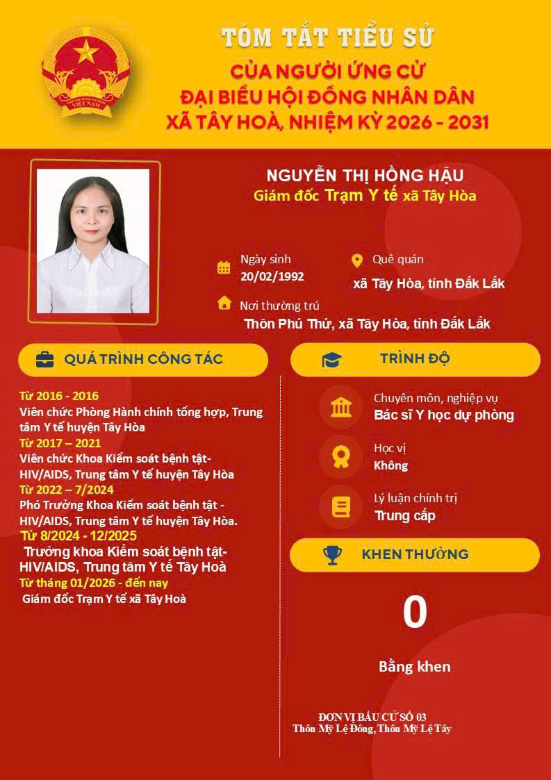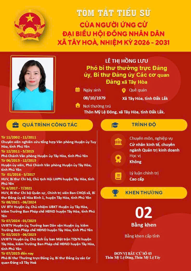Danh sách tóm tắt tiểu sử của người ứng cử đại biểu HĐND xã Tây Hoà, nhiệm kỳ 2026-2031; tại đơn vị bầu cử số 03, gồm Thôn Mỹ Lệ Đông, thôn Mỹ Lệ Tây