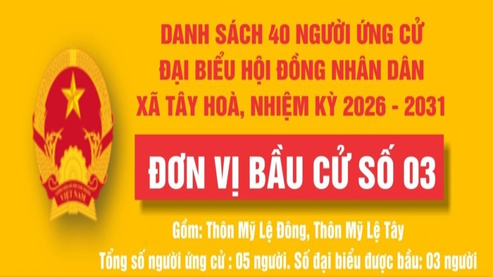DANH SÁCH 05 ỨNG VIÊN THAM GIA ỨNG CỬ ĐẠI BIỂU HĐND XÃ TÂY HÒA, NHIỆM KỲ 2026-2031. Tại Đơn vị bầu cử số 03, gồm: Thôn Mỹ Lệ Đông, thôn Mỹ Lệ Tây