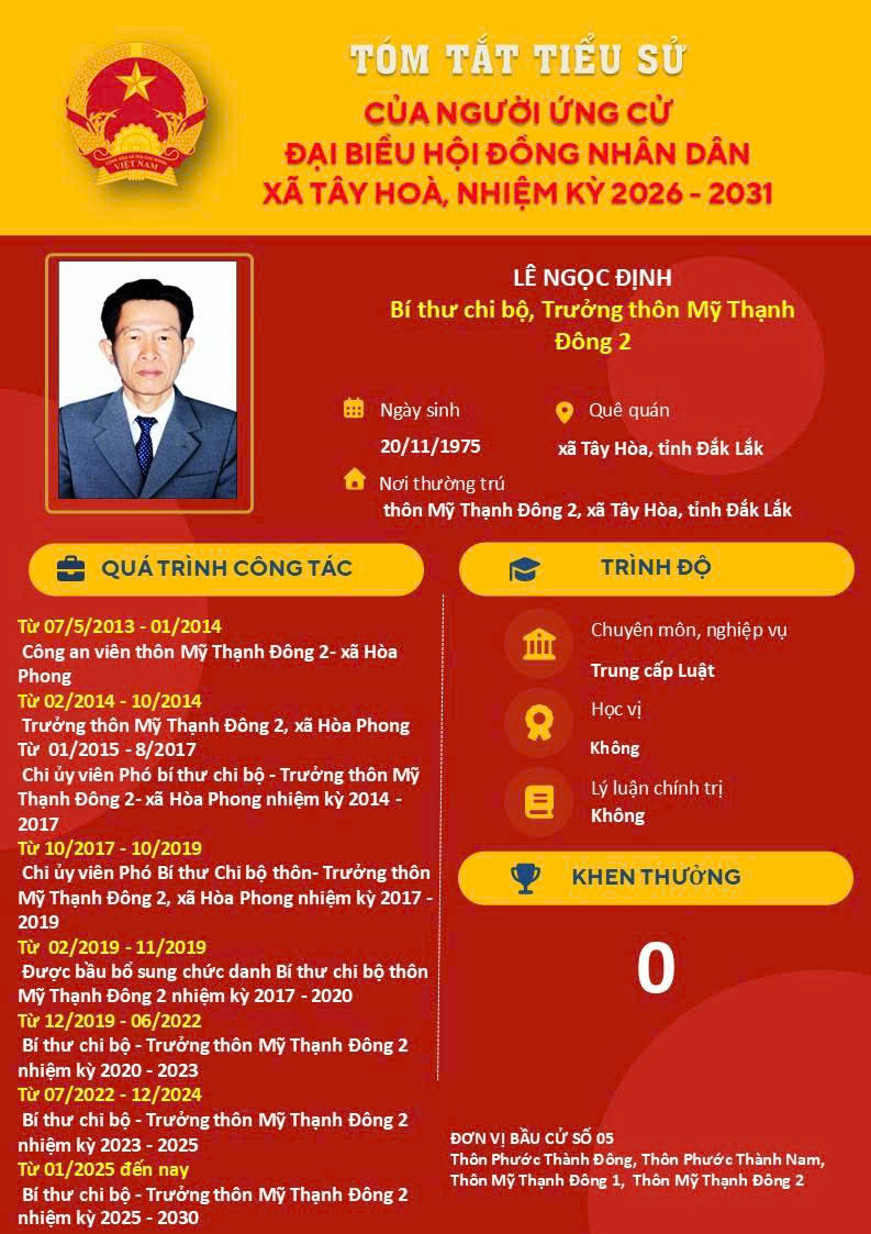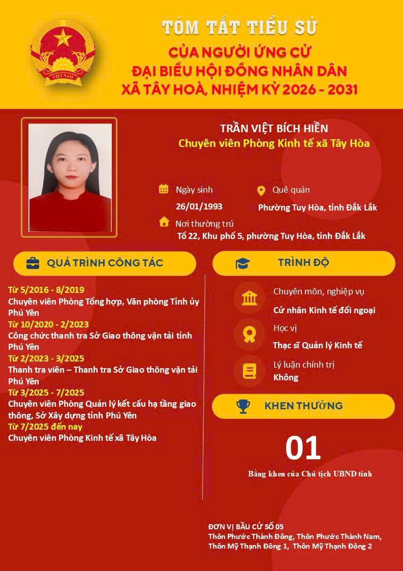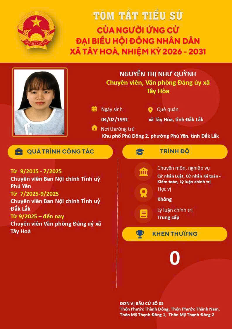 Danh sách tóm tắt tiểu sử của người ứng cử đại biểu HĐND xã Tây Hoà, nhiệm kỳ 2026-2031; tại đơn vị bầu cử số 05, gồm Thôn Phước Thành Đông, thôn Phước Thành Nam, Thôn Mỹ Thạnh Đông 1, Thôn Mỹ Thạnh Đông 2.