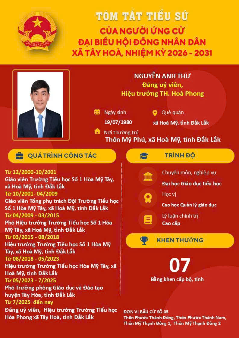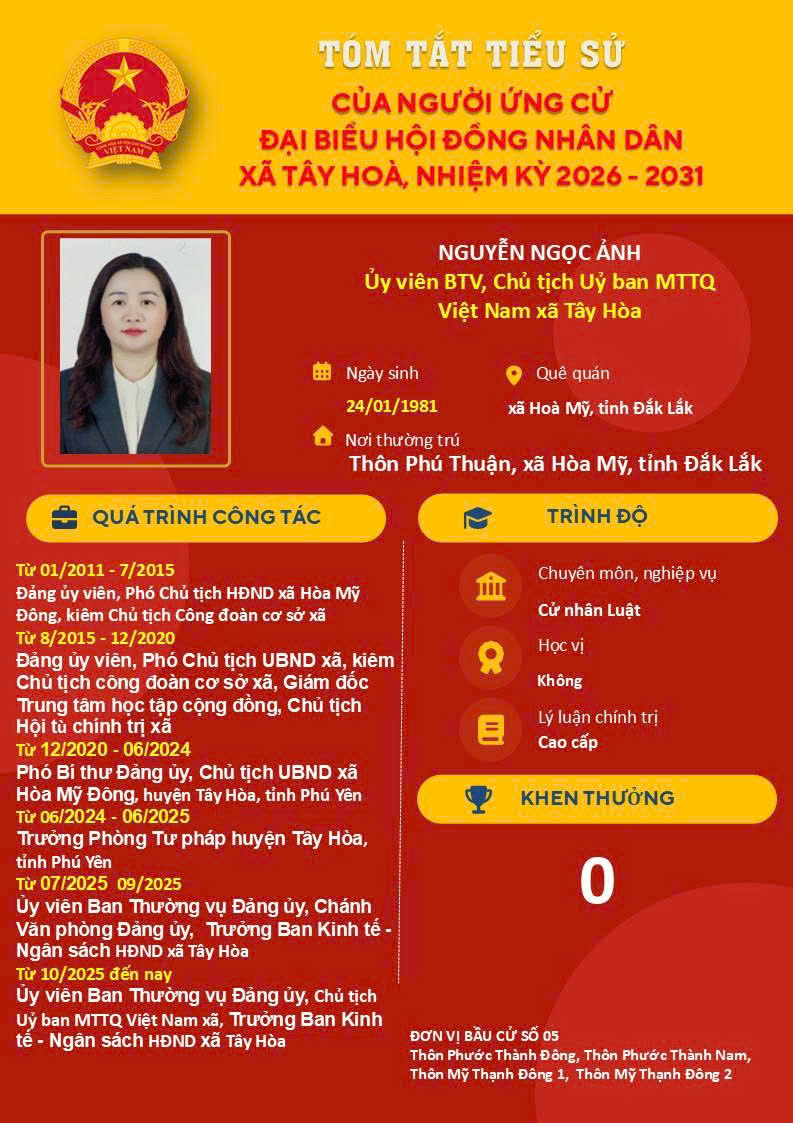 DANH SÁCH 05 ỨNG VIÊN THAM GIA ỨNG CỬ ĐẠI BIỂU HĐND XÃ TÂY HÒA, NHIỆM KỲ 2026-2031. Tại Đơn vị bầu cử số 05, gồm: Thôn Phước Thành Đông, thôn Phước Thành Nam, Thôn Mỹ Thạnh Đông 1, Thôn Mỹ Thạnh Đông 2