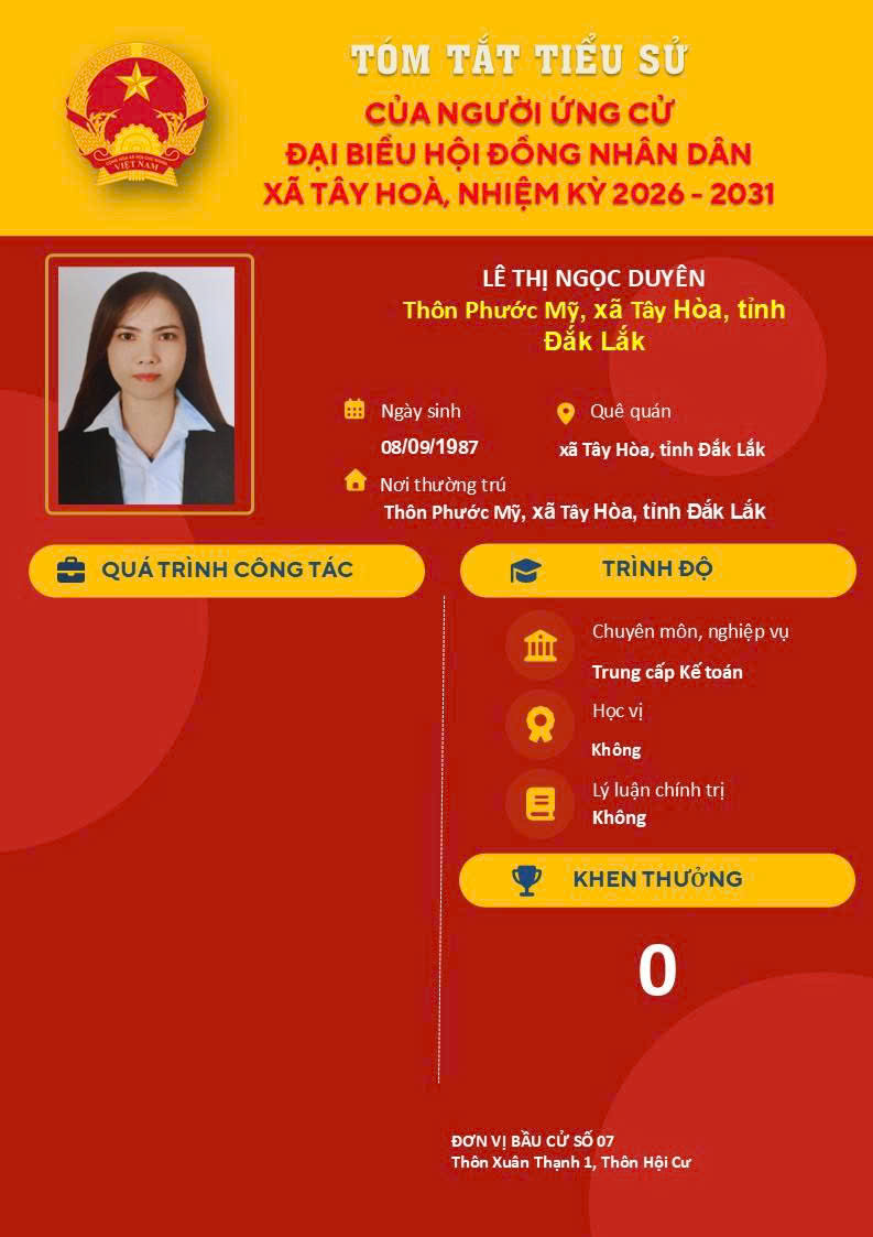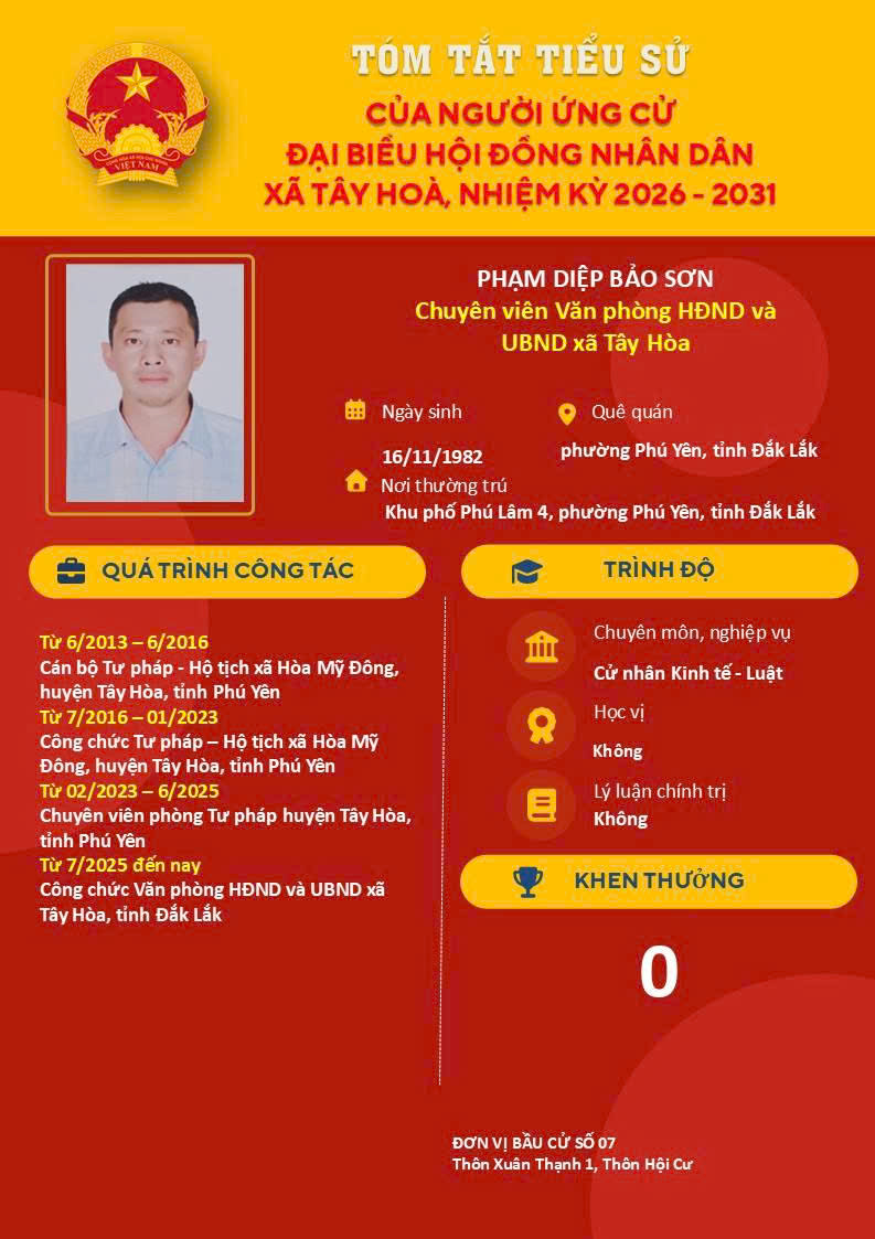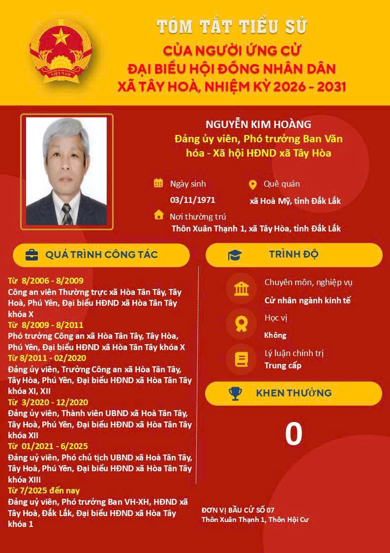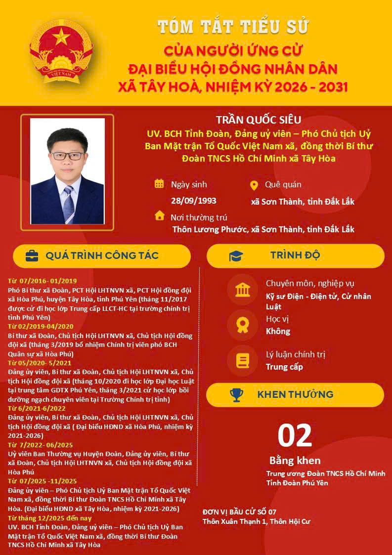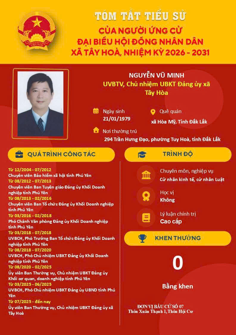 DANH SÁCH 05 ỨNG VIÊN THAM GIA ỨNG CỬ ĐẠI BIỂU HĐND XÃ TÂY HÒA, NHIỆM KỲ 2026-2031. Tại Đơn vị bầu cử số 07, gồm: Thôn Xuân Thạnh 1, thôn Hội Cư. 06/03/2026 Danh sách tóm tắt tiểu sử của người ứng cử đại biểu HĐND xã Tây Hoà, nhiệm kỳ 2026-2031; Tại Đơn vị bầu cử số 07, gồm: Thôn Xuân Thạnh 1, thôn Hội Cư. Chia sẻ: