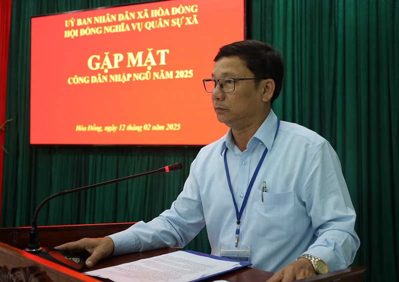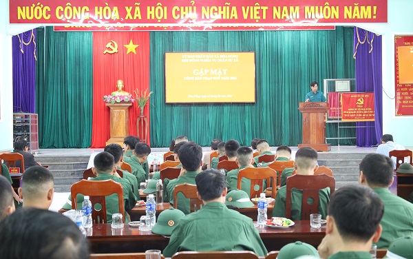 Phát biểu tại buổi gặp mặt, đồng chí Đinh Ngọc Sum, Phó Bí thư Đảng uỷ, Chủ tịch UBND xã, Chủ tịch Hội đồng NVQS xã ghi nhận và biểu dương những đoàn viên, thanh niên ưu tú đã chấp hành nghiêm lệnh gọi công dân nhập ngũ, đảm bảo đủ quân số, đúng thời gian quy định. Đồng chí nhấn mạnh: Môi trường quân đội là trường học lớn, là dịp để thanh niên rèn luyện, học hỏi và trưởng thành, là cơ hội để khẳng định sức trẻ, xây dựng tính kỷ luật và ý chí vươn lên, sẵn sàng làm nhiệm vụ và tiếp bước truyền thống vẻ vang của các thế hệ cha anh trong sự nghiệp xây dựng bảo vệ Tổ quốc. Đảng bộ, chính quyền và Nhân dân xã Hoà Đồng luôn tin tưởng các thanh niên khi nhập ngũ vào quân đội, công an sẽ có nhận thức đúng đắn, đầy đủ về trách nhiệm, nghĩa vụ của bản thân đối với quê hương, đất nước; luôn đoàn kết, khắc phục khó khăn, vững vàng, toàn tâm toàn ý phấn đấu rèn luyện vươn lên hoàn thành xuất sắc nghĩa vụ thiêng liêng đối với Tổ quốc, trở thành những chiến sĩ giỏi. Sau khi hoàn thành tốt nghĩa vụ quân sự, các thanh niên sẽ trở về giúp ích cho xã hội, tham gia các phong trào ở địa phương, góp phần xây dựng xã Hoà Đồng ngày càng phát triển, văn minh, giàu đẹp.