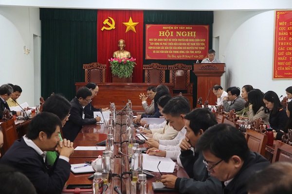 Ngày 06/01, Huyện ủy Tây Hòa tổ chức Hội nghị học tập, quán triệt và tuyên truyền nội dung Cuốn sách “Xây dựng và phát triển nền văn hóa Việt Nam tiên tiến, đậm đà bản sắc dân tộc” của đồng chí Nguyễn Phú Trọng và các văn bản của Trung ương, của tỉnh, huyện.