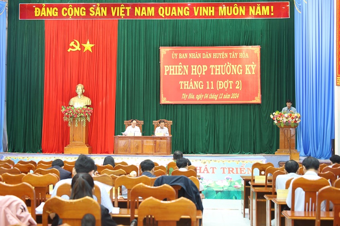 Chiều ngày 04/12, UBND huyện Tây Hòa tổ chức phiên họp thường kỳ tháng 11/2024 (đợt 2) để cho ý kiến Dự thảo Báo cáo kết quả thực hiện nhiệm vụ công tác tháng 11 và một số công tác trọng tâm tháng 12 năm 2024. Các đồng chí: Trần Minh Trí, Phó Bí thư Huyện ủy, Chủ tịch UBND huyện; Mai Ne, UVBTV Huyện ủy, Phó Chủ tịch Thường trực UBND huyện đồng chủ trì phiên họp.