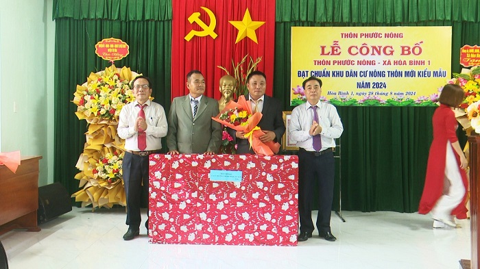 Lãnh đạo huyện Tây Hòa tặng hoa và trao quà chúc mừng thôn Phước Nông đạt chuẩn khu dân cư NTM kiểu mẫu 2024