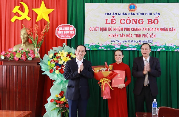 Tại buổi lễ, đại diện Phòng Tổ chức cán bộ Toà án nhân dân tỉnh đã thông qua Quyết định bổ nhiệm chức vụ Phó Chánh án Toà án nhân dân huyện Tây Hoà. Theo đó, bổ nhiệm đồng chí Nguyễn Thị Hoan, sinh năm 1980, Thẩm phán Toà án nhân dân bậc 2, Toà án nhân dân huyện Tây Hoà giữ chức vụ Phó Chánh án Toà án nhân dân huyện Tây Hoà, thời hạn bổ nhiệm 05 năm kể từ ngày 01/3/2025.
