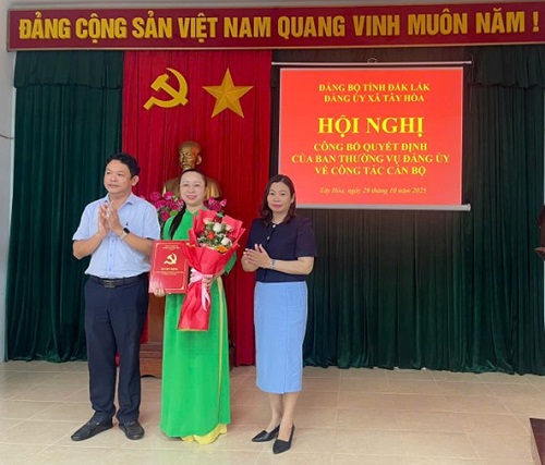Tại hội nghị, các đại biểu đã nghe Ban Xây dựng Đảng công bố quyết định của Ban Thường vụ Đảng ủy về việc bổ nhiệm đồng chí Lê Thị Mỹ Linh, ĐUV, Phó Trưởng Ban Xây dựng Đảng giữ chức vụ Trưởng Ban Xây dựng Đảng Đảng ủy xã Tây Hòa, đồng thời phân công, bổ nhiệm đồng chí giữ chức vụ Giám đốc Trung tâm Chính trị Tây Hòa, kể từ ngày 31/10/2025. Thời hạn bổ nhiệm là 05 năm.