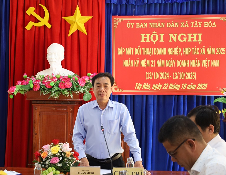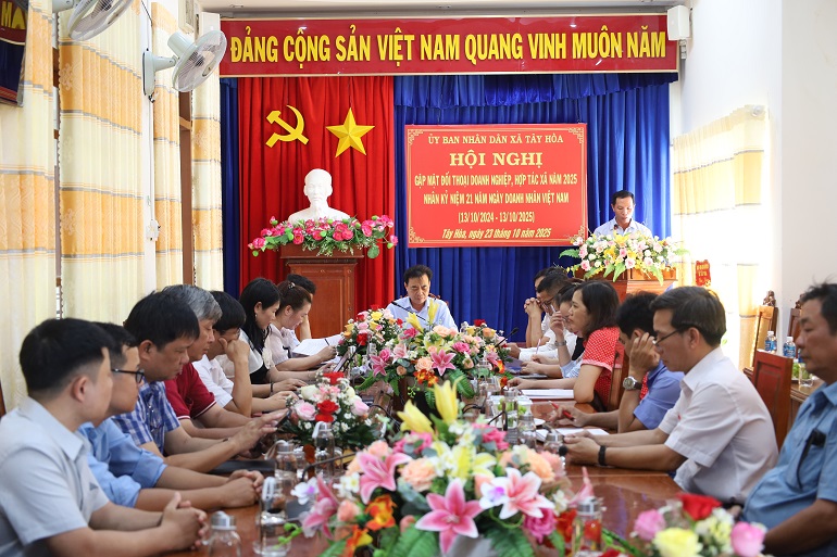 Chiều ngày 23/10, UBND xã Tây Hòa tổ chức Hội nghị gặp mặt, đối thoại với các Doanh nghiệp, Hợp tác xã (HTX) năm 2025 nhằm nắm bắt tình hình sản xuất – kinh doanh, kịp thời tháo gỡ khó khăn, tạo điều kiện thúc đẩy kinh tế – xã hội phát triển. Đồng chí Lê Văn Mười – Phó Bí thư Đảng ủy, Chủ tịch UBND xã Tây Hòa chủ trì Hội nghị.