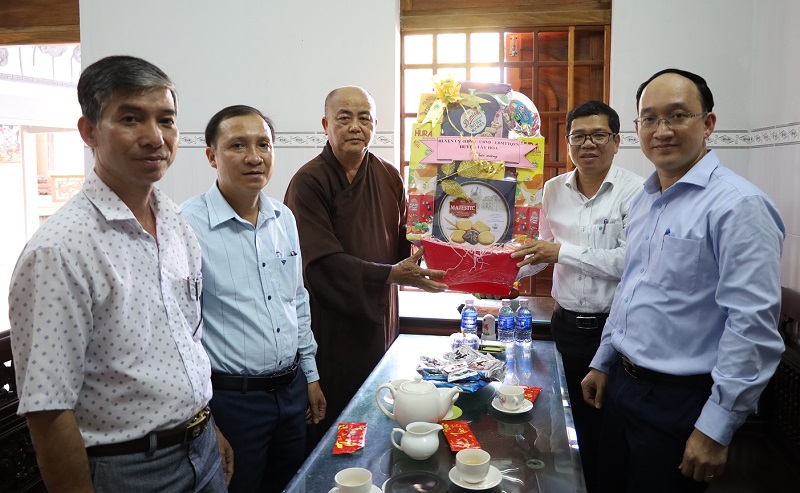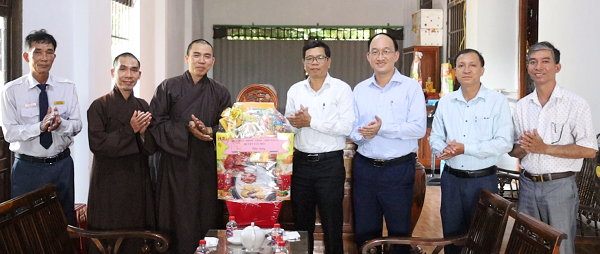 Các đồng chí: Nguyễn Phương Đông, TUV, Bí thư Huyện uỷ và Trần Minh Trí, Phó Bí thư Huyện uỷ, Chủ tịch UBND huyện cùng đoàn công tác thăm, chúc mừng chùa Hương Tích (xã Hoà Mỹ Tây)