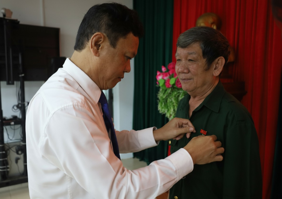 Bí thư Đảng ủy Phan Xuân Hạnh gắn Huy hiệu 45 năm tuổi Đảng cho đảng viên Lê Văn Nên, sinh hoạt tại Chi bộ thôn Mỹ Lệ Đông