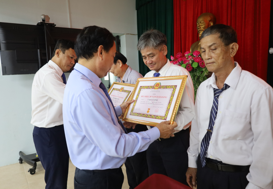 Các đồng chí: Phan Xuân Hạnh, Lê Văn Mười trao Huy hiệu 30 năm tuổi Đảng cho các đảng viên
