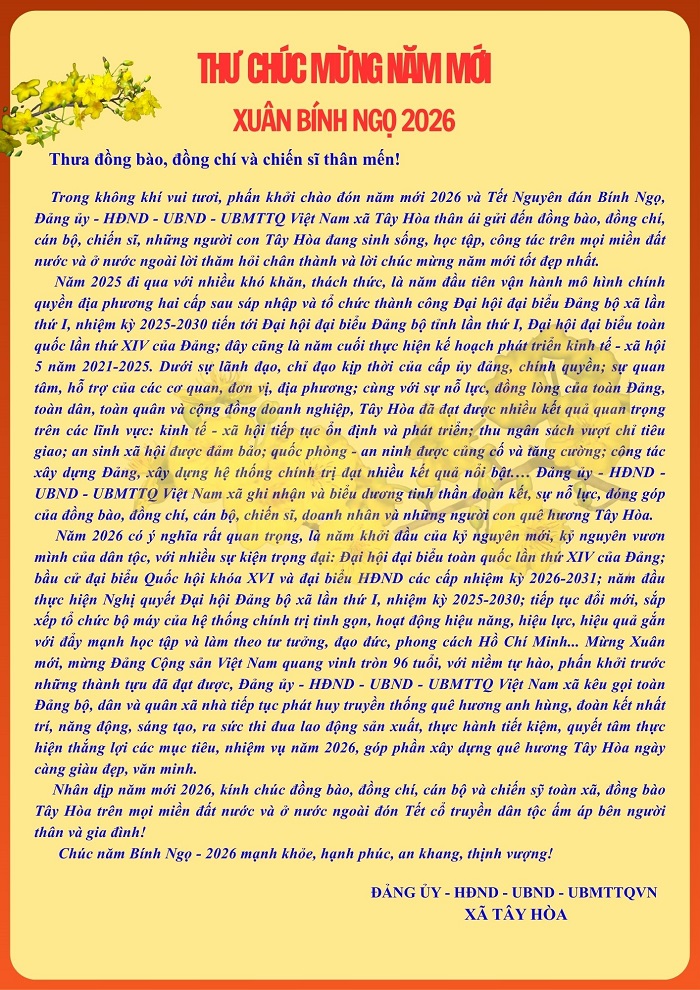 Thư chúc mừng năm mới của Đảng ủy – HĐND – UBND – Ủy ban MTTQ Việt Nam xã Tây Hòa 15/02/202616/02/2026 Chia sẻ:
