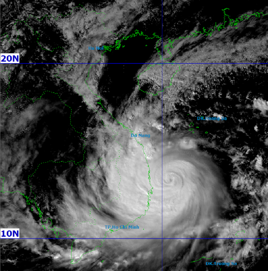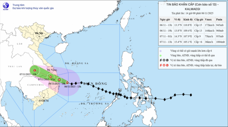 Lúc 14 giờ ngày 6/11, vị trí tâm bão: Khoảng 13,3 độ Vĩ Bắc; 110,5 độ Kinh Đông, cách Quy Nhơn (Gia Lai) khoảng 150km về phía Đông Đông Nam. Sức gió mạnh nhất: Cấp 14-15 (150-183km/h), giật trên cấp 17. Dự báo: Trong 3 giờ tới, bão di chuyển chủ yếu theo hướng Tây Tây Bắc, tốc độ khoảng 25-30km/h.