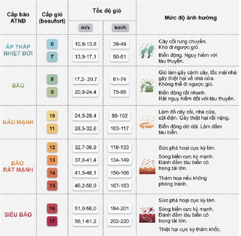 Trên biển – Vùng biển ngoài khơi: Gió mạnh cấp 8-12; vùng gần tâm bão đi qua mạnh cấp 13-15, giật trên cấp 17, sóng biển cao 6,0-8,0m, vùng gần tâm bão cao 9,0-11,0m; biển động dữ dội.