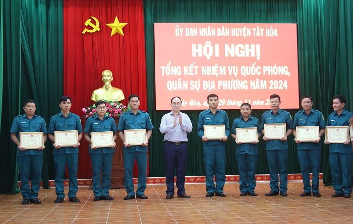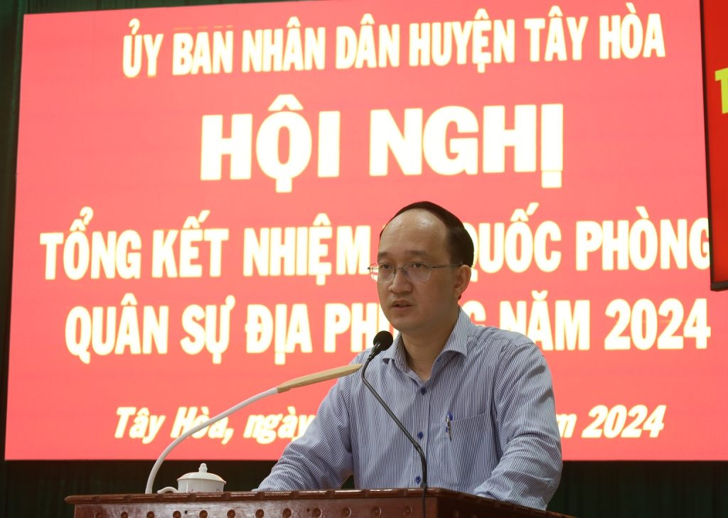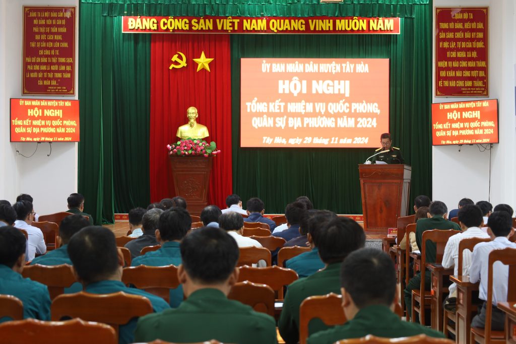 Theo báo cáo tại Hội nghị, năm 2024, huyện Tây Hoà đã tập trung lãnh đạo, chỉ đạo lực lượng vũ trang huyện và các cơ quan, đơn vị, các xã, thị trấn khắc phục khó khăn, hoàn thành toàn diện mục tiêu, yêu cầu, nhiệm vụ công tác quốc phòng, quân sự địa phương; chỉ đạo xây dựng, huấn luyện lực lượng vũ trang huyện vững mạnh, toàn diện, sẵn sàng chiến đấu đáp ứng yêu cầu, nhiệm vụ trong tình hình mới. Đã tổ chức giao quân cho các đơn vị 275/275 công dân, đạt 100% chỉ tiêu giao. Xây dựng lực lượng bộ đội thường trực, Dân quân tự vệ, Dự bị động viên đạt chỉ tiêu kế hoạch, đảm bảo chất lượng; tiếp tục thực hiện có hiệu quả công tác bồi dưỡng kiến thức quốc phòng an ninh cho các đối tượng; tổ chức diễn tập CH-TM đạt kết quả tốt; tham gia các hội thi, hội thao đạt thành tích cao;… qua đó góp phần giữ vững an ninh chính trị, trật tự an toàn xã hội, tạo động lực thúc đẩy phát triển kinh tế – xã hội, hoàn thành tốt nhiệm vụ công tác quốc phòng tại địa phương.