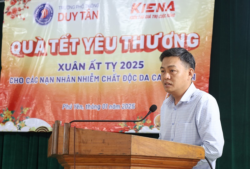 Phát biểu tại buổi trao quà, đồng chí Phan Công Trinh, HUV, Phó Chủ tịch UBND huyện đã cảm ơn sự quan tâm, những tình cảm mà Trường Phổ thông Duy Tân Phú Yên, Công ty Cổ phần Kiến Á, thành phố Hồ Chí Minh và Hội Nạn nhân chất độc dam cam tỉnh đã dành cho những nạn nhân chất độc da cam của huyện Tây Hoà, góp phần cùng huyện thực hiện tốt các chính sách an sinh xã hội trên địa bàn huyện.