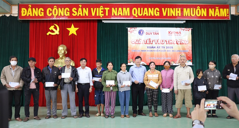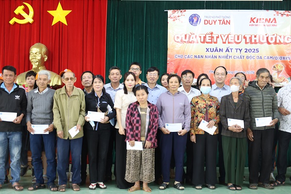 Đại diện lãnh đạo Hội Nạn nhân chất độc da cam tỉnh Phú Yên và Trường Phổ thông Duy Tân trao quà cho các nạn nhân