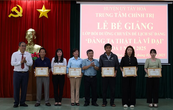 Chiều ngày 21/02, Trung tâm Chính trị huyện Tây Hòa tổ chức lễ bế giảng lớp bồi dưỡng chuyên đề lịch sử Đảng – “Đảng ta thật là vĩ đại” khóa I/2025. Đồng chí Đỗ Văn Cấp, Phó Bí thư Thường trực Huyện uỷ, Chủ tịch HĐND huyện đã về dự.